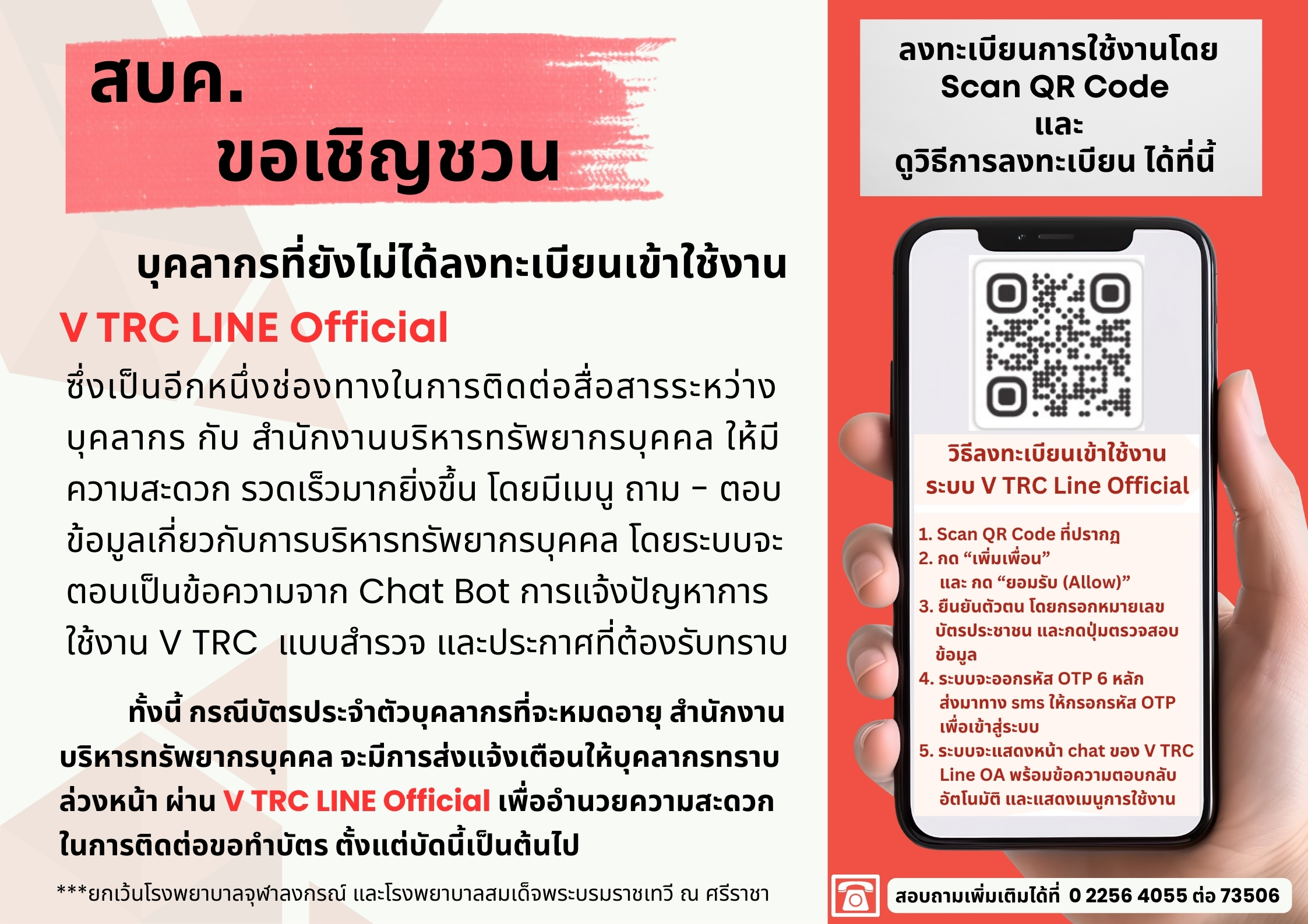 เชิญชวนบุคลากรที่ยังไม่ได้ลงทะเบียนเข้าใช้งาน V TRC LINE Official เข้าลงทะเบียน
