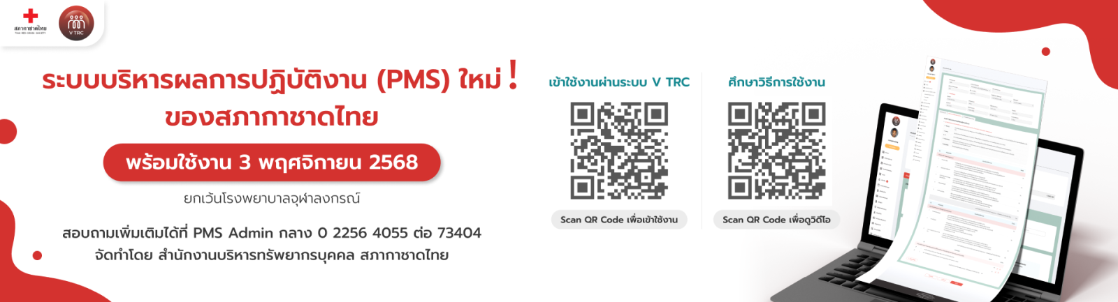 - หากมีข้อสงสัยในการใช้งานระบบ สามารถติดต่อสอบถามได้ที่ PMS Admin กลาง สำนักงานบริหารทรัพยากรบุคคล (สบค.) สภากาชาดไทย โทร. 02-2564055 ต่อ 73404