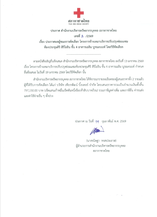 ประกาศผลผู้ชนะการคัดเลือก โครงการจ้างเหมาบริการปรับปรุงซ่อมแซมห้องประชุมศิริ สิริโยธิน ชั้น 4 อาคารเฉลิม บูรณะนนท์